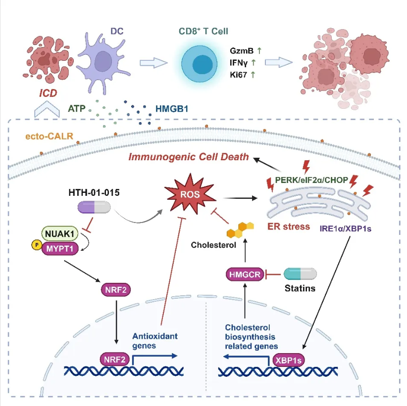 综上所述,本研究揭示了靶向甲羟戊酸途径与NUAK1抑制剂联合使用在癌症治疗中的潜力。通过抑制胆固醇合成,可以增强NUAK1抑制剂诱导的免疫原性细胞死亡,进而增强抗肿瘤免疫反应。这一发现为开发新的癌症联合治疗方案提供了理论基础,特别是在面对当前免疫检查点抑制剂和他汀类药物治疗效果有限的情况下。此外,本研究还为进一步探讨胆固醇在肿瘤免疫中的双重角色提供了新的视角,为未来临床前及临床研究提供了参考与指导建议。