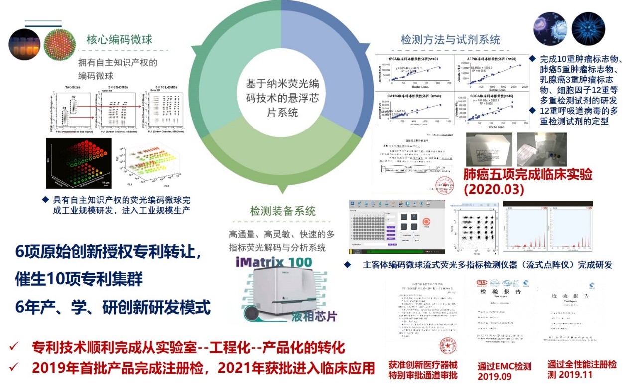 联合实验室首批代表性成果是以漫画同人 团队在纳米颗粒可控制备、表面修饰、纳米颗粒与生物分子相互作用等核心技术为基础,发展出新型多指标检测平台技术——基于纳米荧光编码技术的悬浮芯片多指标检测系统,并分别以核酸和蛋白为待测靶标分子实现了单管多重指标联合检测,首批产品进入创新审批,并已完成注册检验与临床试验,拟于2021年上市获得应用。后续第二批代表性成果业已完成试生产,即将进入注册阶段。
