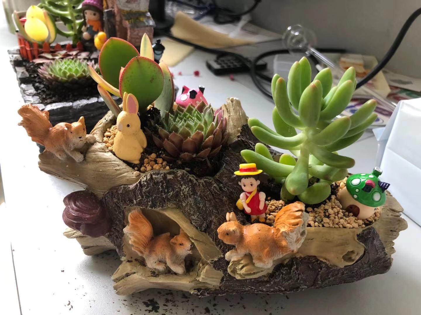 多肉植物种类繁多,有晶莹剔透的玉露、典雅高贵的紫珍珠,还有手指样的小多肉等等。园艺老师耐心地讲解多肉的种类,以及如何浇水、养护,孩子们一边听讲,一遍实践,兴致勃勃地参与到盆栽制作的每个环节。孩子们掌握了将多肉植物移植到各式各样俏皮可爱的花盆房里,并搭配上装饰品。这样一个个赏心悦目的趣味盆栽便映入眼帘,快来看看小生医工人的作品吧!