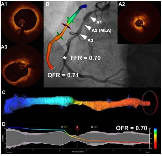 涂圣贤团队研制了一种基于冠脉影像评估血管生理功能的定量血流储备分数检测仪。系统可安装在医院介入导管室,通过网络获取导管室造影机采集的造影影像或血管内成像影像,实现快速冠状动脉三维重建与血流储备分数计算(含QFR、OFR与UFR),用于在线判断重建血管的解剖参数与功能缺血状况,以优化支架植入手术。