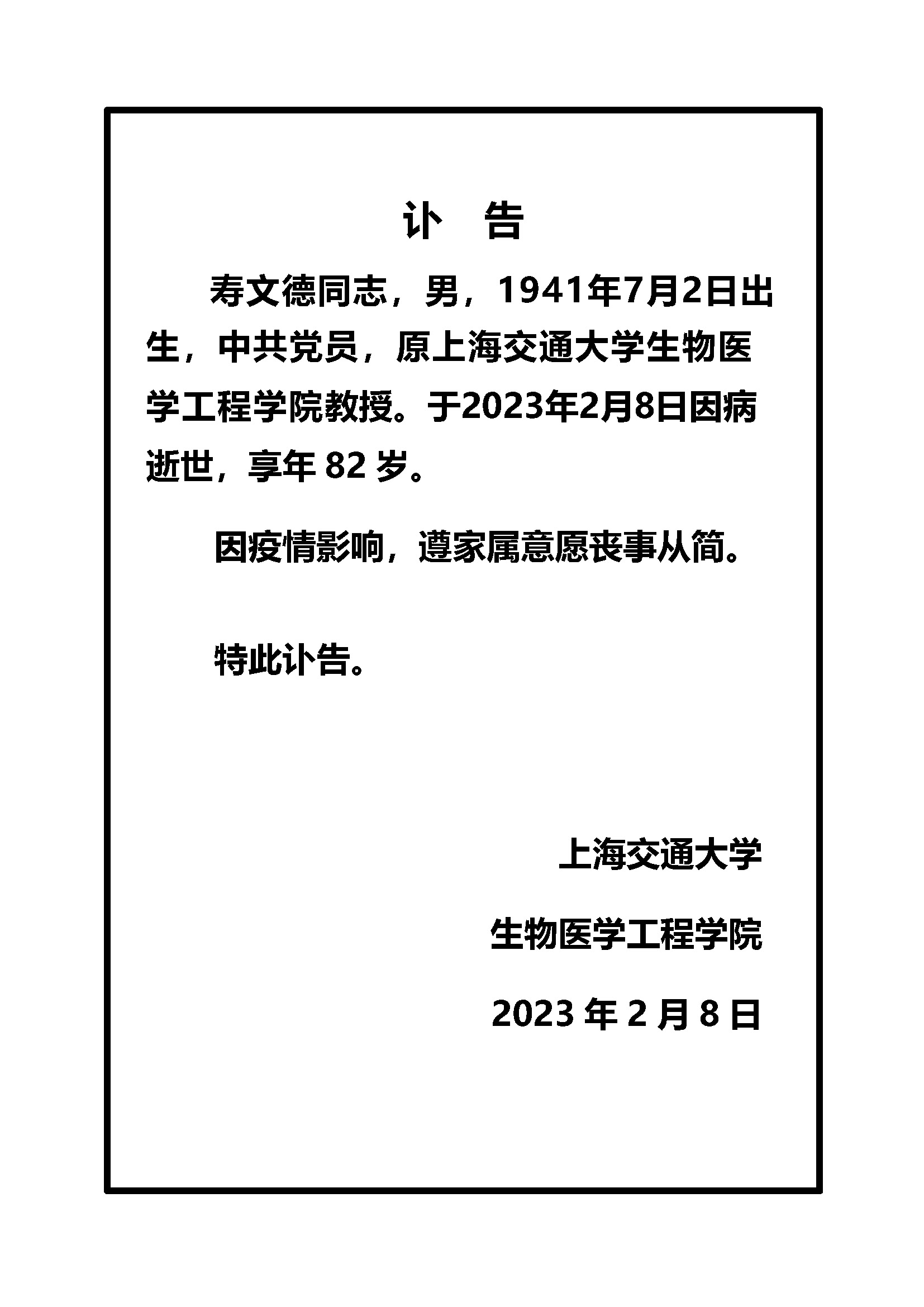 寿文德同志讣告
