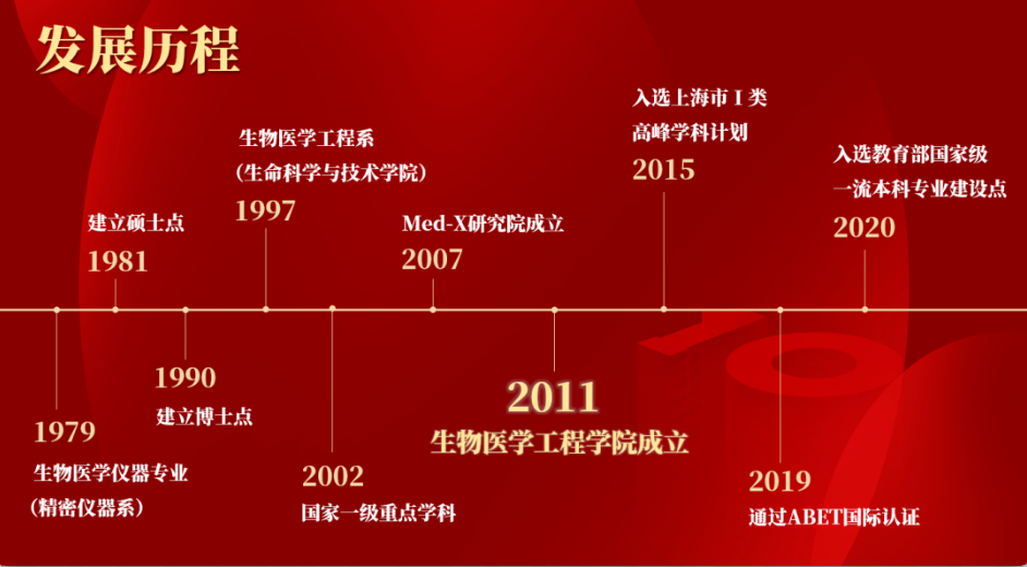 成立于2011年4月,秉承“敢为人先、追求卓越”的精神,致力于医工、医理交叉研究和创新型人才培养,依托交大优质的工程学和医学临床资源,逐步形成“医工交叉、国际化、创新转化”的办学特色,2019年成为国内唯一通过ABET国际认证的生物医学工程专业,并入选教育部第一批一流本科专业建设计划。其学科历史可追溯至1979年创办的生物医学仪器专业,是国内最早创办的生物医学工程专业