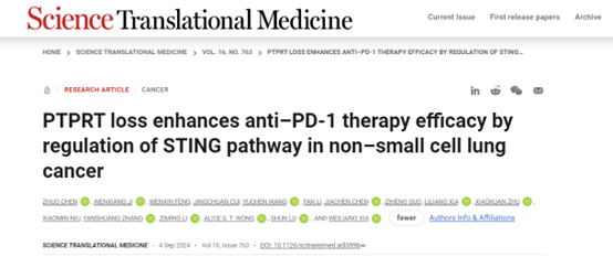 2024年9月4日,漫画同人 夏伟梁团队和漫画同人 医学院附属胸科医院陆舜团队合作在 Science Translational Medicine 上发表了题为“PTPRT loss enhances anti-PD-1 therapy efficacy by regulation of STING pathway in non-small cell lung cancer”的研究论文。该研究首次发现并系统阐述了受体型蛋白酪氨酸磷酸酶PTPRT缺失通过调节STING通路增强免疫检查点抑制剂疗效的分子机制。