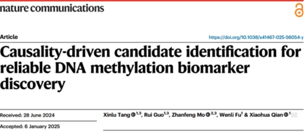 [1] Xinlu Tang#, Rui Guo#, Zhanfeng Mo#, Wenli Fu, Xiaohua Qian*. Causality-driven candidate identification for reliable DNA methylation biomarker discovery. Nature Communications, 2025, 16: 680.