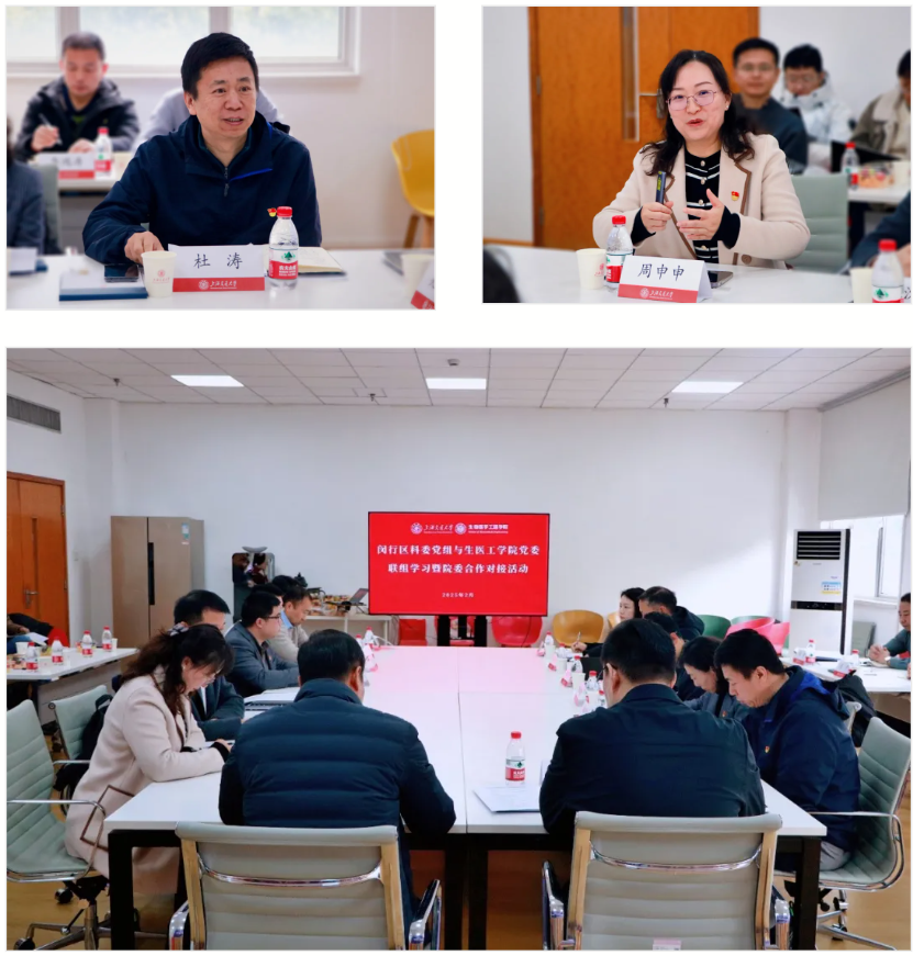为强化党建引领,深入贯彻落实全国科技工作会议精神和全国教育大会精神,2月21日上午,学院党委与闵行区科委党组开展联组学习暨院委合作对接系列活动。闵行区科委党组书记、主任吴昌飞,党组副书记、科协主席杜涛一行12人与学院党委书记孔令体,党委副书记周申申,教工支部书记及委员,教师代表等共计30余人参加了本次活动。