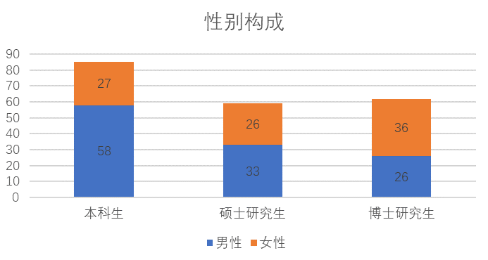 就学历层次而言,本科生85人,硕士生59人,博士生62人。