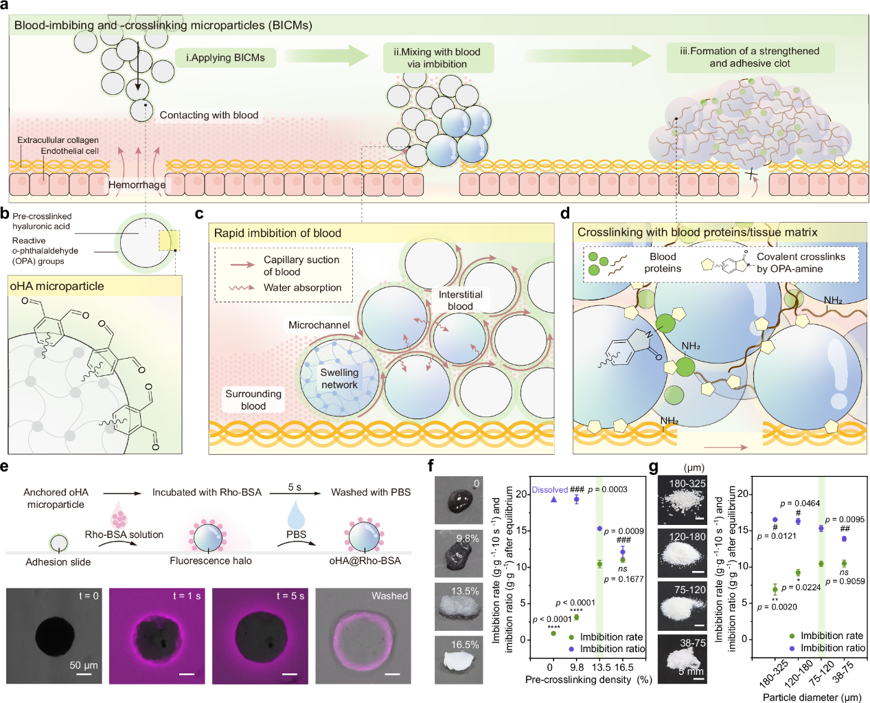 考虑到其良好的吸液保水特性、生物相容性以及生物可降解性,研究团队选取了预交联透明质酸作为止血微颗粒的骨架材料。为了实现与血液蛋白和组织基质的共价交联,研究团队将与氨基具有高反应活性的邻苯二甲醛基团接枝到微颗粒表面。结果表明,该微颗粒(BICMs)能够快速吸收液体,并与溶液中的蛋白实现共价交联(图1)。