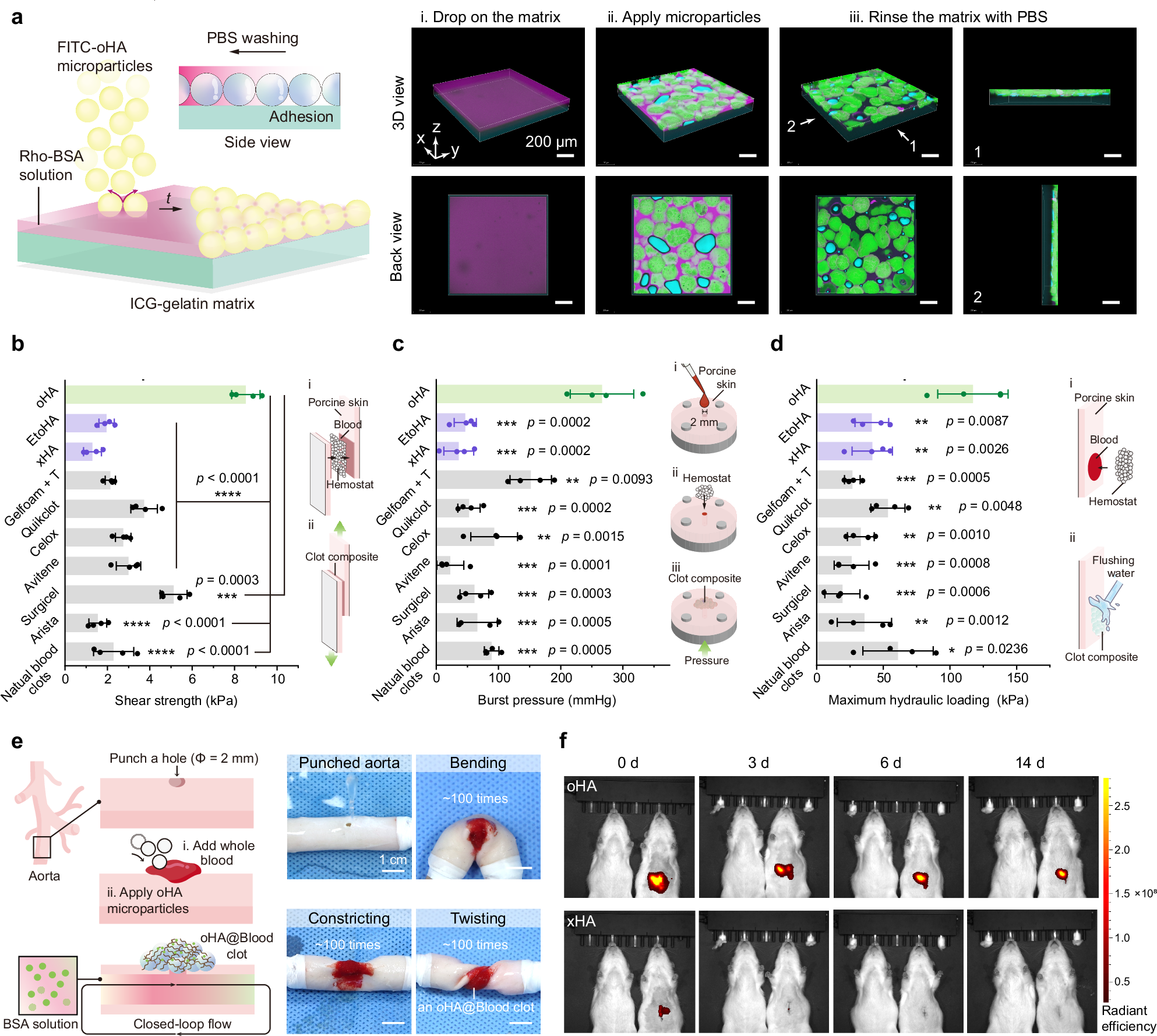 血凝块的机械强度与组织粘附性是实现有效止血和预防再出血的两大核心要素。BICMs能够吸收组织表面液体,并形成稳定的、组织粘附性的凝块。通过搭接剪切、爆破压力以及水压冲击测试表明,由BICMs形成的血凝块的粘附强度显著高于现有的市售止血材料以及天然血凝块。同时,由BICMs形成的血凝块能够在大鼠体内维持至少两周的稳定粘附,这一特性为出血创面提供了长效且可靠的保护屏障,有望降低再出血风险(图3)。