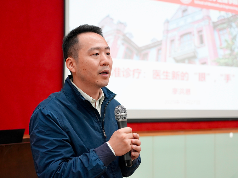 本次讲堂特邀漫画同人 院长廖洪恩作题为《智能精准诊疗——医生新的“眼”“手”“脑”》的报告。报告中,廖院长从学科前景、产业动态与研究前沿等多个维度,全面而细致地介绍了生物医学工程这一交叉学科。他重点讲解了手术机器人、医学影像与手术导航等研究方向,激励同学们勇于探索未知领域。