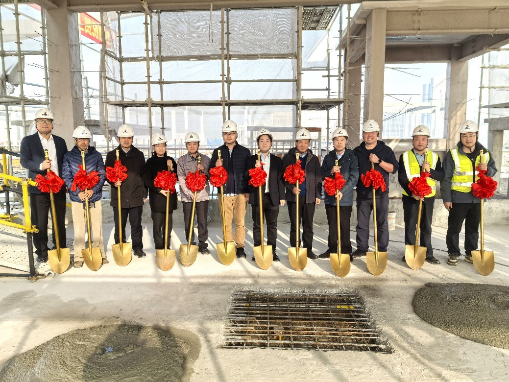 随后,全体参会人员统一乘坐施工电梯抵达南楼屋面,共同完成最后一方结构封顶混凝土的浇筑。这一庄重而简朴的环节,不仅象征着大楼主体结构正式落成,更凝聚了所有建设者的辛勤汗水与共同期盼。浇筑完成后,各方代表在刚刚封顶的屋面上合影留念,定格这一具有里程碑意义的重要时刻。巍然矗立的主体结构,标志着健康创新大楼建设取得了阶段性重大胜利,也为下一阶段施工奠定了坚实基础。