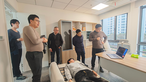 在随后的项目交流环节,教师代表分别展示了各自团队在无感监护系统与电阻抗精密测量等方向的技术应用与转化进展,理邦仪器技术负责人就监护产品线研发概况以及技术需求进行介绍,并与教师围绕潜在的合作切入点开展初步探讨。会后,来宾受邀参观了教师实验室与转化公司。