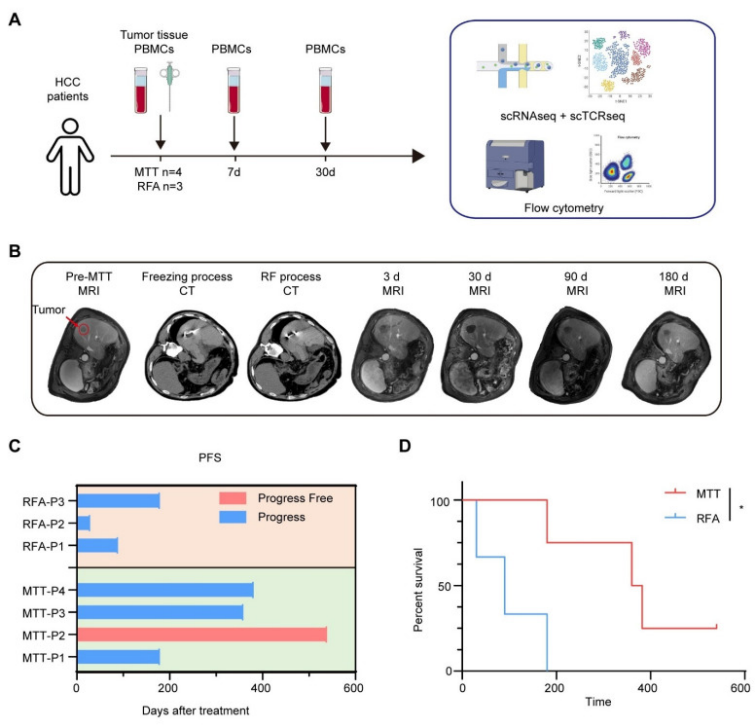 复发性肝细胞癌(HCC)作为高发恶性肿瘤,热物理消融是局部肿瘤治疗的重要手段,且能通过促进肿瘤抗原的释放,激活全身性抗肿瘤免疫。然而,传统局部消融方法诱导的免疫响应不足以诱导足够强烈的免疫保护。多模态肿瘤治疗(MTT)是一种新型局部消融技术,通过多物理模态融合技术,实现肿瘤细胞精准破碎,原位大量释放的肿瘤抗原与危险信号分子(DAMPs)可作为“原位疫苗”,肿瘤完全消融同时系统性调节全身免疫环境。