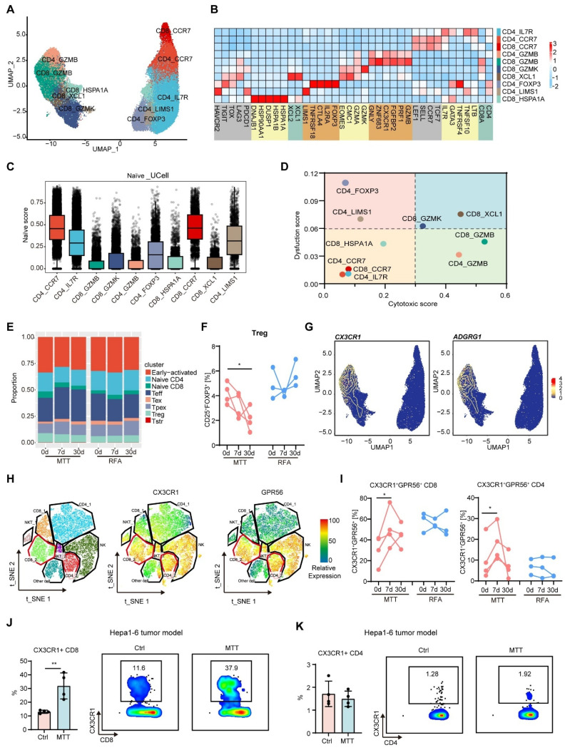 为深入探究多模态肿瘤治疗延长患者PFS的免疫学机制,通过对患者术前肿瘤组织、外周血,以及术后7天、30天外周血连续采样,结合单细胞转录组测序、单细胞TCR测序、流式细胞术等技术,全面刻画治疗前后的免疫景观动态变化;同时构建小鼠肝癌皮下肿瘤模型,验证关键免疫细胞亚群的功能与调控通路。研究发现,两组患者治疗前免疫景观无明显差异,而在治疗后,多模态肿瘤治疗组患者较RFA组患者树突状细胞成熟、NK细胞毒性分子表达、B细胞体液免疫应答上调,并诱导了CX3CR1+GPR56+ T细胞扩增,同时Tregs比例显著下调。结合动物模型研究证明,CX3CR1+GPR56+ T细胞高表达颗粒酶B、穿孔素、等效应细胞因子,并具有更强的向瘤内迁移的能力。治疗后7天CX3CR1评分与患者PFS呈正相关,提示多模态肿瘤治疗诱导的CX3CR1+GPR56+ 效应T细胞比例增加,是HCC患者良好临床预后的生物标志物。